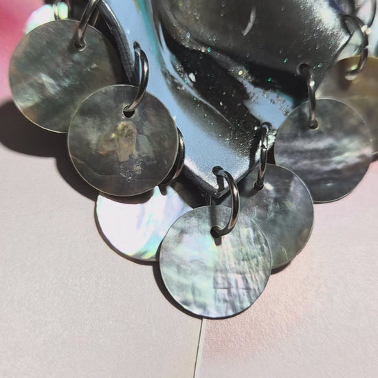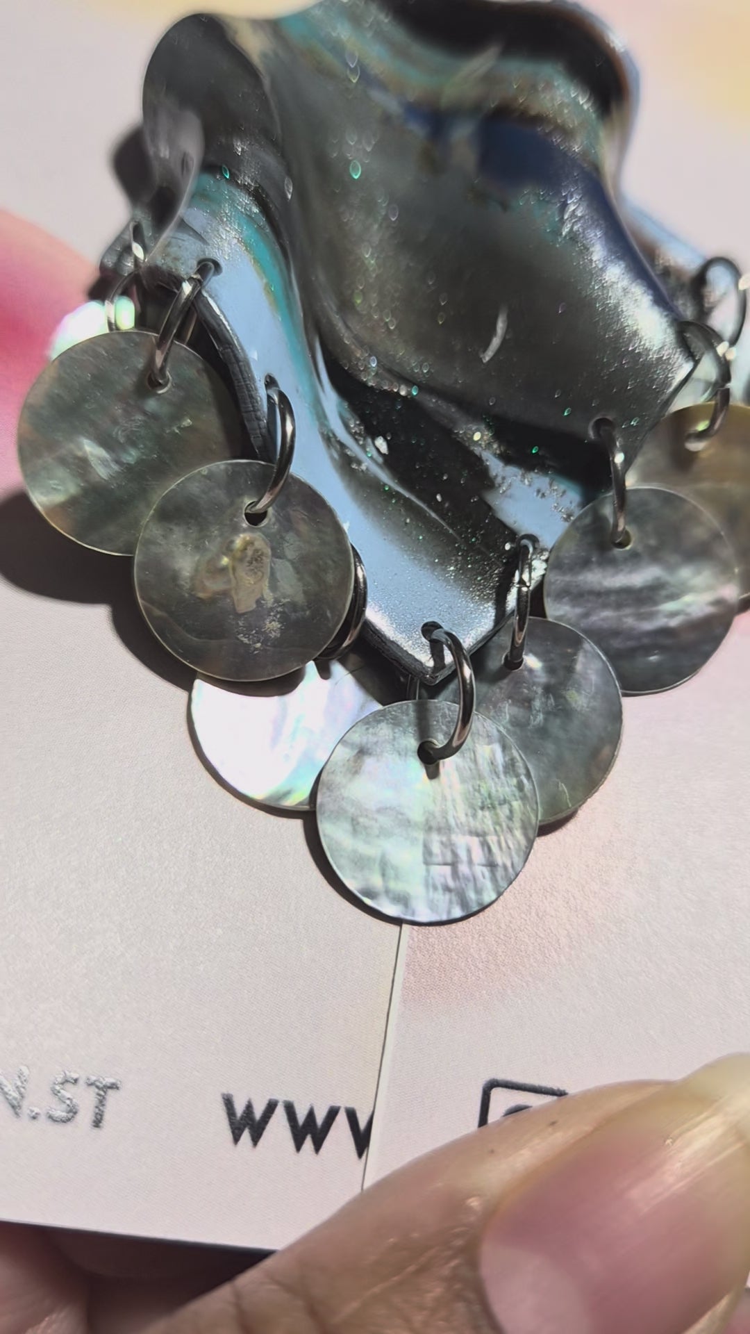 DPI is where digital precision meets divine flow. Named after "dots per inch," a nod to both print resolution and these circular shell beads, this design plays with movement, light, and layered meaning. The sculpted metallic top mimics molten fabric - a frozen wave of energy - while the shell discs dance with every motion, reflecting the frequencies you radiate.