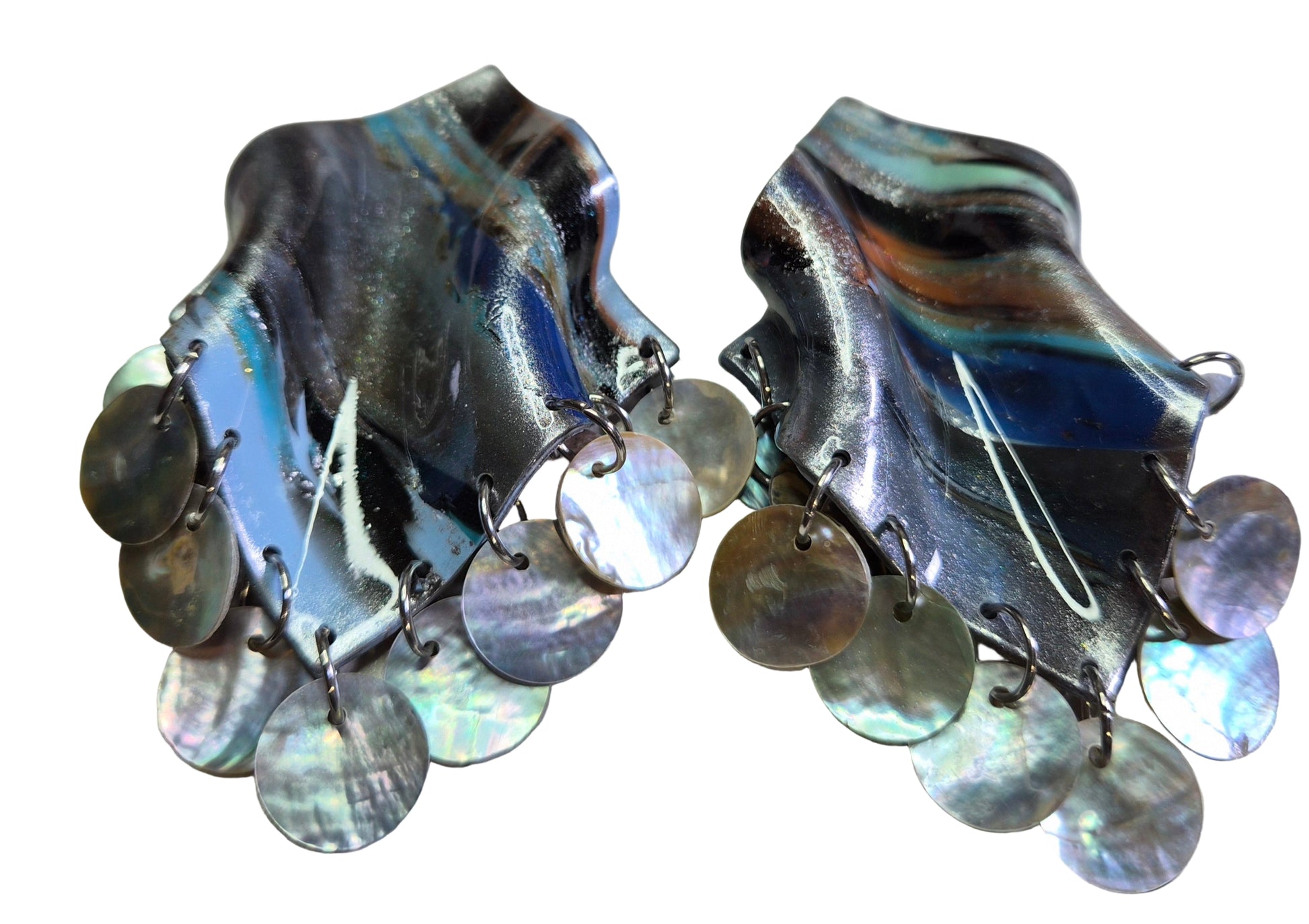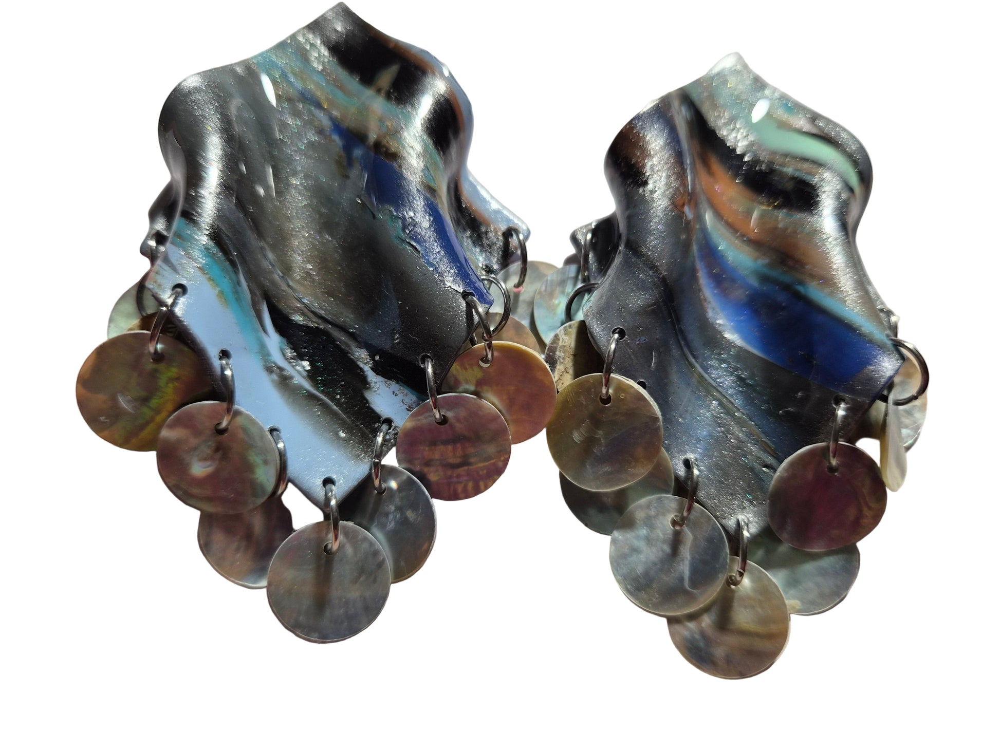 Material: Hand-sculpted polymer clay, sealed with resin for shine and longevity. Iridescent shell discs. 18k gold plated or stainless-steel jump rings/earring posts/butterfly earring backs for pierced ears.