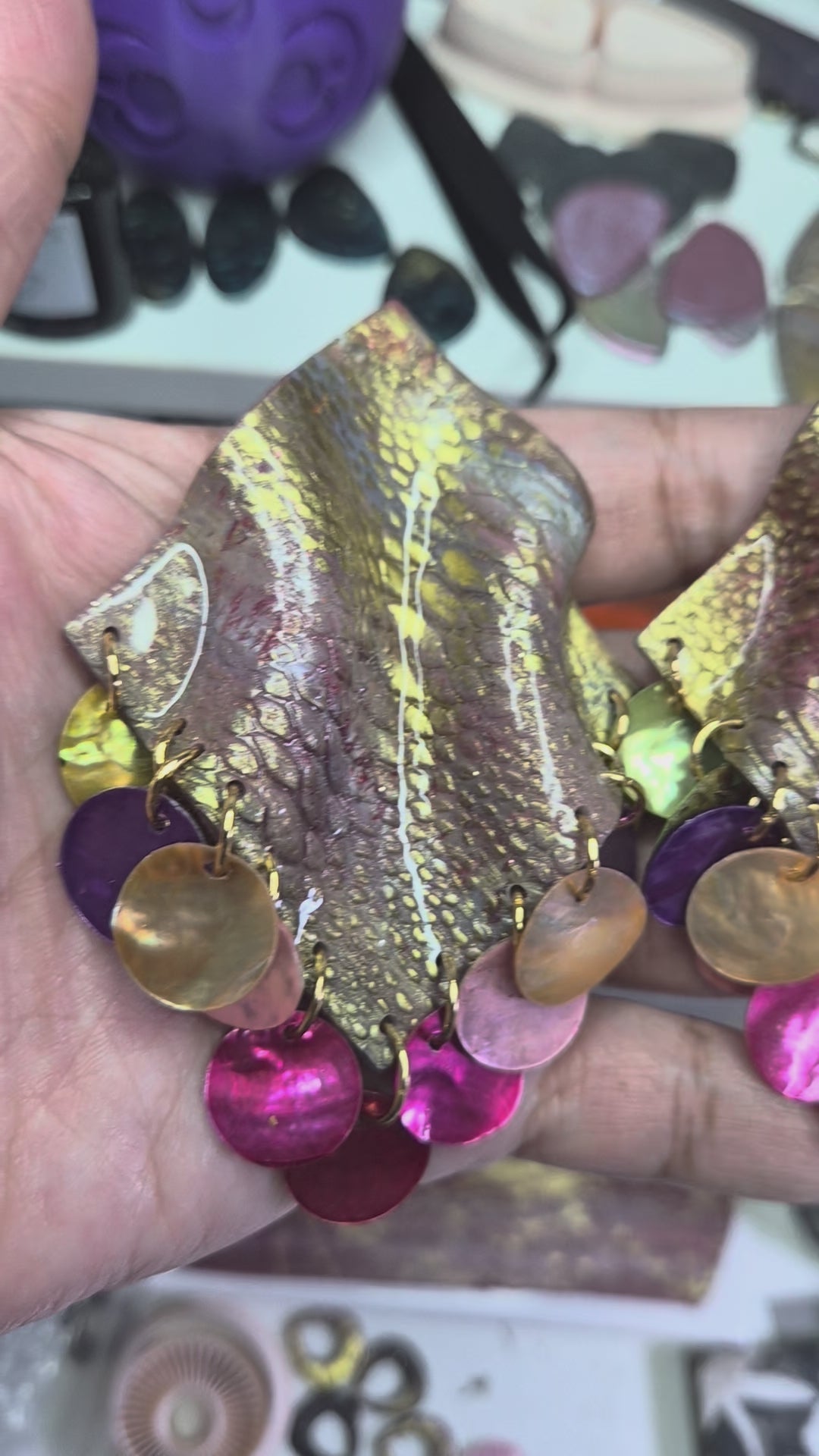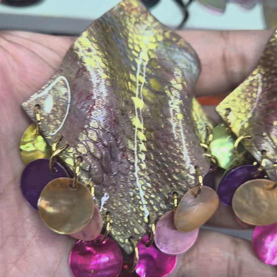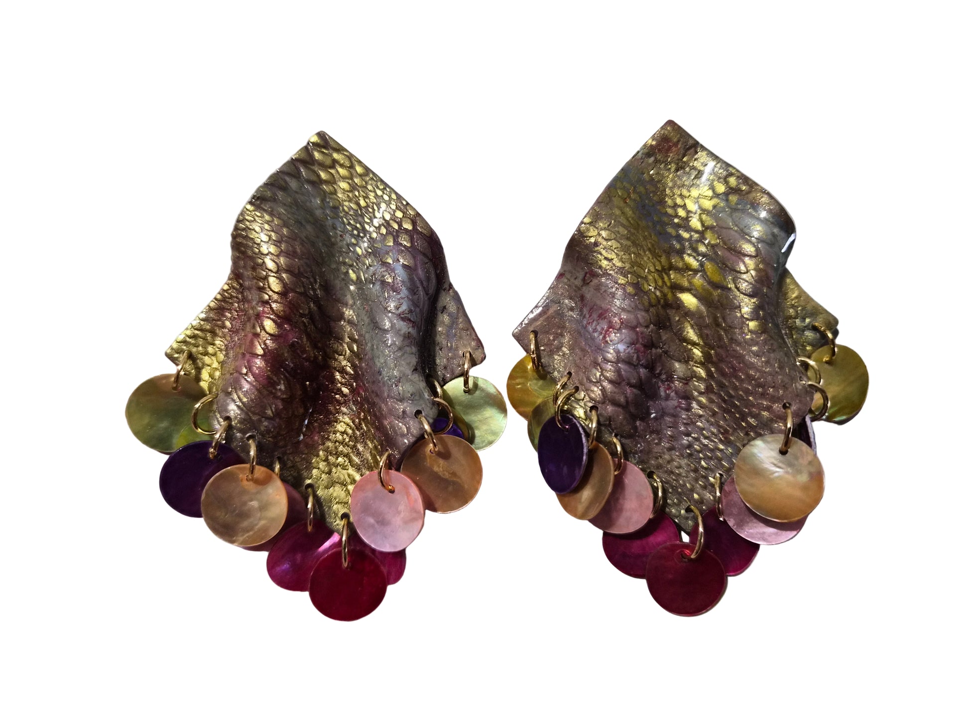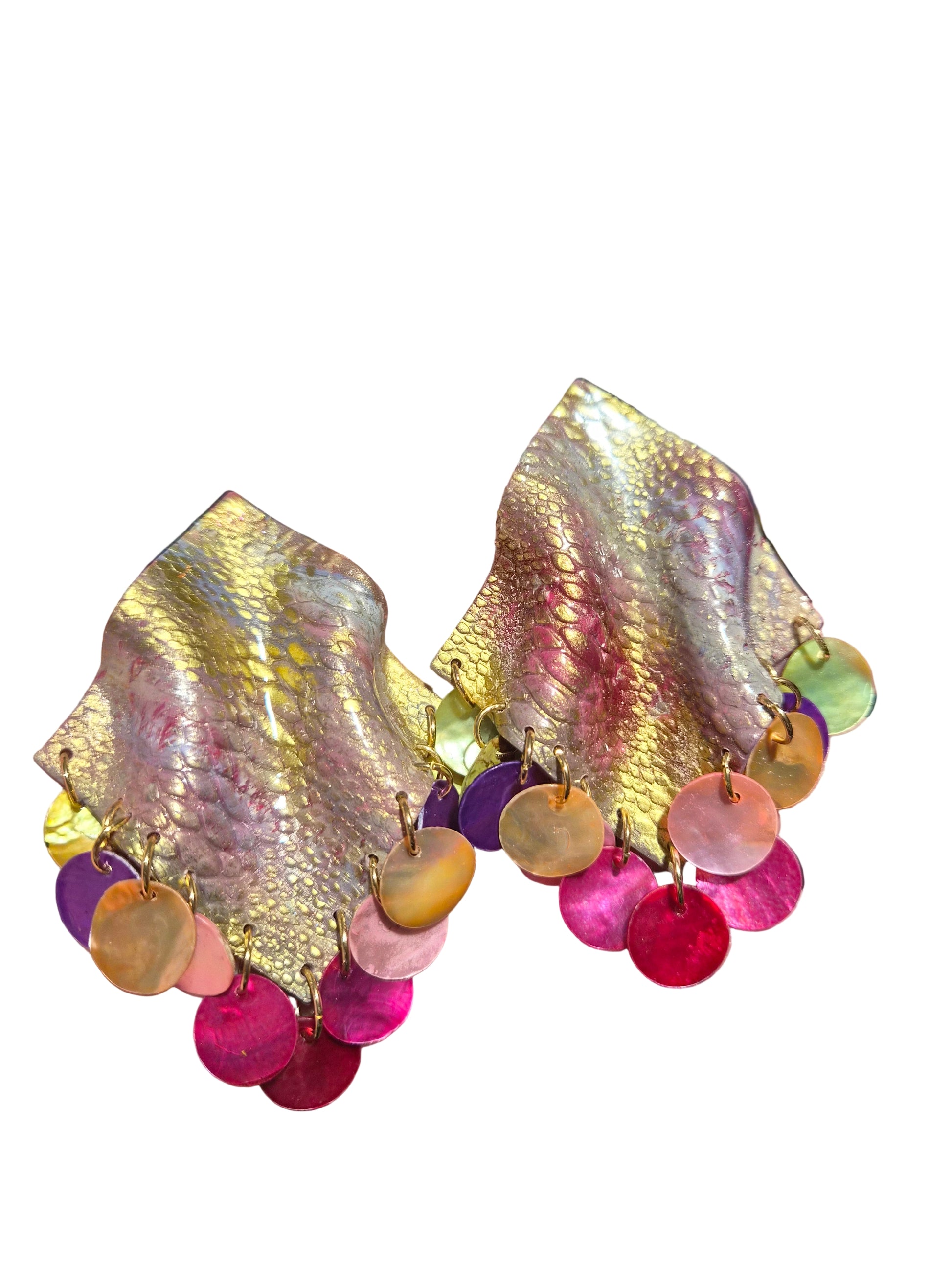 Material: Hand-sculpted polymer clay, sealed with resin for shine and longevity. Iridescent shell discs. 18k gold plated or stainless-steel jump rings/earring posts/butterfly earring backs for pierced ears.